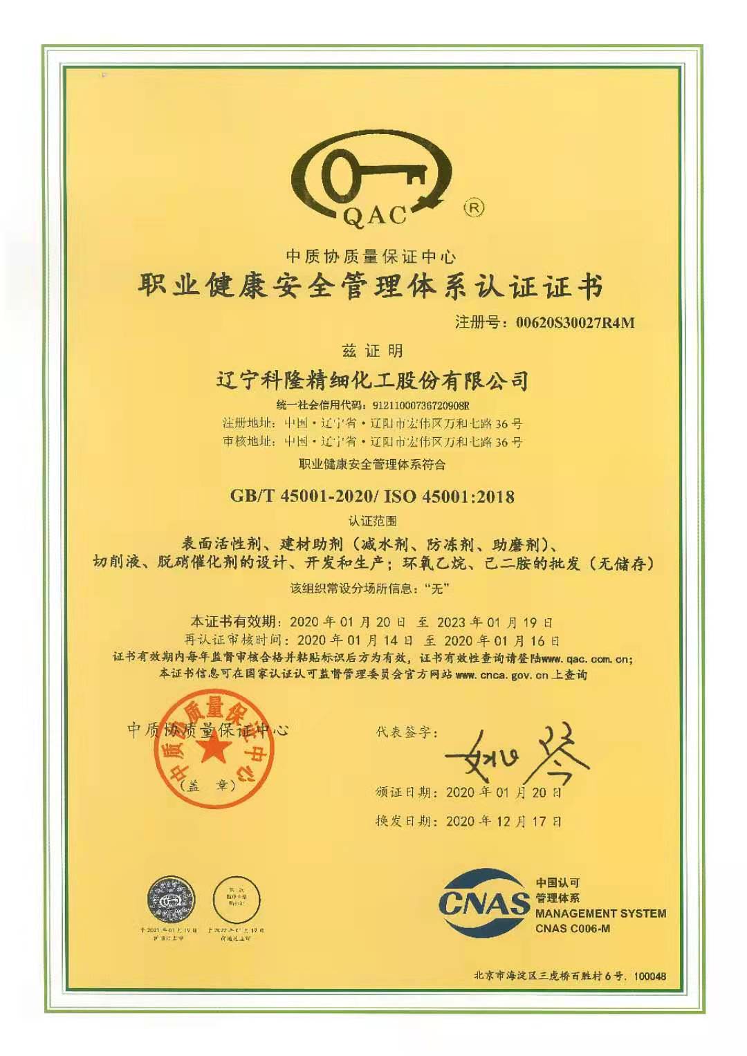 職業健康安全管理體系認證證書